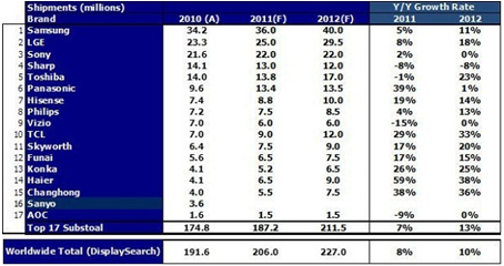 如下表所估計,2011年前十六大品牌之合計出貨量為1億8,700萬臺,占 2011年全球的出貨的91%,但較2010年前十六大品牌的出貨合計只成長了7%,根據 DisplaySearch 的估計2011年全球液晶電視出貨也只較2010年成長8%,由此可見主要領導品牌的出貨達成與全球液晶電視的出貨實績息息相關。