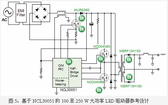 另一款專用LED電源集成電路是NCL30051,能夠為降壓直流-直流(DC-DC)轉換器/LED驅動器提供恒定電壓。該器件集成了一個臨界導電模式(CrM) PFC控制器及一個半橋諧振控制器,并內置600V驅動器,針對離線電源應用進行了優化,具備了所有實現高能效、小外形因數設計所需的特性。