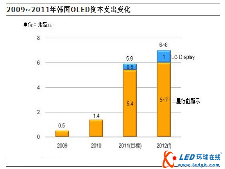 做為全球發展OLED最積極地區,韓國除三星行動顯示器(SamsungMobiLEDisplay;SMD)逐年擴大投資AMOLED面板外,LGDisplay(LGD)亦自2011年起正式展開AMOLED面板投資計畫,于此背景下,2011年韓國OLED資本支出將為5.9兆韓元(約52億美元)規模,且2012年更將上看8兆韓元(約72億美元)。