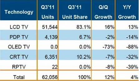 - 2011年第三季全球電視總出貨量較去年上升3.7%