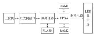 系統采用新一代的32bitRISC處理器STM32作為主控芯片,通過以太網傳輸數據,以FLASH作為存儲模塊,由FPGA完成對LED顯示屏的高速掃描刷新。系統工作時,利用上位機編輯顯示信息,通過以太網接口將顯示信息傳輸給微處理器,微處理器接收數據信息后寫入FLASH存儲器。在顯示時,微處理器讀取FLASH中的數據,通過總線將數據以并行方式發送給FPGA,FPGA處理后將數據傳輸到LED顯示屏顯示。