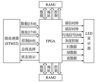LED顯示屏是利用LED點陣模塊或像素單元組成的一種現代平面顯示屏幕,具有發光效率高、使用壽命長、視角范圍大、色彩豐富以及對室內外環境適應能力強等優點。20世紀80年代后期,它在全世界迅速發展起來,并很快成為大屏幕平板顯示的代表性主流產品;近年來,隨著藍色LED產品價格的快速下降,全彩色LED顯示屏的價格逐步降低,市場需求急劇增長,應用日益普遍。目前的LED顯示屏控制系統多采用ARM處理器來完成整個系統的功能,這種控制系統在數據處理速度上存在很大的局限,影響顯示效果的連續性。基于此,在分析了STM32微處理器總線結構特點的基礎上,提出了STM32+FPGA的控制系統方案,該方案充分了利用STM32微處理器的靈活的儲器控制技術和可編程邏輯器件的靈活性,提高了系統數據處理的速度,而且簡化了電路結構,方便調試。