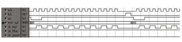 掃描驅動輸出信號的仿真波形如圖5所示,其中en是灰度控制信號,用來控制顯示時間,產生灰度效果;row_sel是行選信號,顯示時用于確定點亮哪一行;sck是移位時鐘,lck是鎖存時鐘,ds_red、ds_blue、ds_green是上屏紅、藍、綠數據的輸入端。仿真時紅、藍、綠顯示數據分別設定為01交錯、全1、全0。可以看到,在移位時鐘的作用下數據移位正確,移位完成后,lck變為高電平,將數據鎖存輸出到LED屏上顯示。