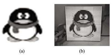 本設計采用32位嵌入式微處理器STM32F103ZET6和可編程邏輯器件EP1C6Q240C8設計了全彩色LED顯示屏控制系統,并在實驗室驗證,實現了LED顯示屏的彩色顯示,圖6(a)為一幅實際圖像,圖6(b)是在顯示屏上的顯示效果。