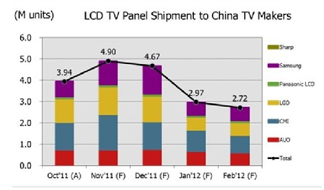 就總體液晶電視面板出貨而言, 預估向中國大陸本土廠商11月出貨量較上月成長24%, 12月較11月下降5%; 而到2012年1月, 面板出貨數量將大幅度下滑至不足300萬片, 較12月下降達到36%。