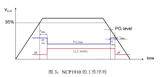 NCP1910的工作序列如圖3所示,如果PFC未就緒,LLC就不能啟動(dòng);一旦PFC就緒,就會(huì)開(kāi)始一段20ms的延遲;延遲結(jié)束后PGout引腳假定為低電平,LLC可以開(kāi)始工作。在撥除交流輸入關(guān)閉電源時(shí)Vbulk降低,到達(dá)PG信號(hào)時(shí),PGout引腳被釋放(開(kāi)路);如果Vbulk到達(dá)LLC停止電平,LLC停止工作;或者如果Vbulk緩慢下降,如處在輕載狀態(tài),LLC會(huì)在PGout引腳被釋放5ms后停止工作。