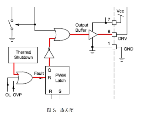 熱關(guān)閉(TSD):過(guò)熱保護(hù)功能有助于實(shí)現(xiàn)良好的電源設(shè)計(jì)。當(dāng)結(jié)點(diǎn)溫度超過(guò)140℃時(shí),該功能激活,驅(qū)動(dòng)器變?yōu)榈碗娖剑唤Y(jié)點(diǎn)溫度降到典型值30℃時(shí)器件恢復(fù)工作。