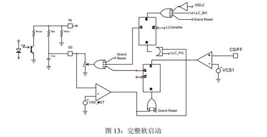 •在軟啟動(dòng)或重啟時(shí),專(zhuān)用引腳將SS電容放電至地,從而提供平順的輸出電壓上升;在LLC被CS/FF引腳(>1V)或BO功能關(guān)閉時(shí),SS引腳給CSS放電,并提供純粹的軟啟動(dòng);