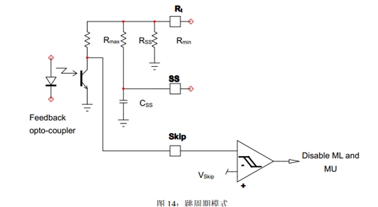 •NCP1910B有跳周期工作功能,當(dāng)反饋腳電壓低于0.4V時(shí),LLC驅(qū)動(dòng)器進(jìn)入跳周期模式,降低頻率,提升輕載能效。