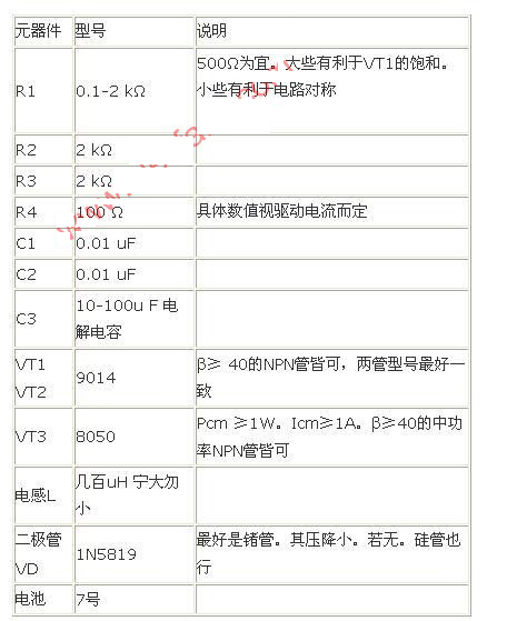 現進行估算。驅動一個LED約要100mW。電源的Po約為20mW。為了保證供給,按P=100mW計算。取η=80%,再隨便找一個幾百uH的電感,如500 uH:另一方面,根據能量守恒。3.3V約為1.2V的3倍。再由于效率問題。電感的驅動電流差不多要LED工作電流的3-4倍,就取為120mA,這樣一來。便可算出振蕩頻率為34kHz左右,這樣,取R=2kΩ,C=0.01 uF便能達到要求。確定參數時。頻率可高不可低,電感寧大勿小,這樣才能保證輸出功率足夠大,才能有足夠的調節空間。