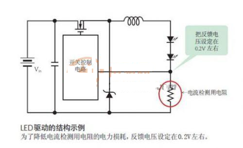 通常,開關(guān)穩(wěn)壓器IC設(shè)定的反饋電壓約為1.2V。但對(duì)于LED驅(qū)動(dòng)IC,1.2V過(guò)大。因?yàn)榘演敵鲭娏鬓D(zhuǎn)換成電壓的數(shù)百mΩ 的電阻(電流檢測(cè)用電阻)需要與LED串聯(lián)。對(duì)于照明器具等使用的高亮度LED,流經(jīng)的是1.5A和2A等大電流。如果500mΩ的電流檢測(cè)用電阻中通過(guò)1.5A的電流,僅此一項(xiàng)就會(huì)產(chǎn)生0.75W的電力損耗。因此,LED驅(qū)動(dòng)IC把反饋電壓設(shè)定在了非常低的0.2V左右。這樣一來(lái),不僅可以使用較小的電流檢測(cè)用電阻,而且在大電流通過(guò)時(shí),也可以把電力損耗控制在較低的水平。