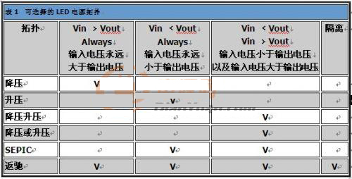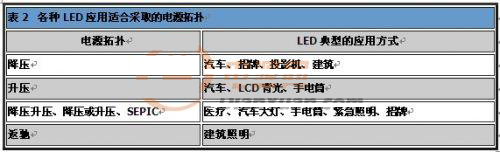 如同表2所示,LED已廣泛運用于各領(lǐng)域,因此需要許多種類的電源拓撲,支持LED的應用。一般而言,必須考慮輸入電壓、輸出電壓及對隔離的需求,以做出適當選擇。