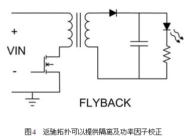 基于安全考慮,可能會規(guī)定在脫機電壓及輸出電壓之間進行隔離。此應用方式下,最節(jié)省成本的解決方法就是使用返馳轉(zhuǎn)換器(圖4),在所有的隔離拓撲中,這種作法所需要的組件數(shù)量最少。變壓器匝數(shù)比可用來對輸出電壓進行降壓、升壓或降壓升壓,設計彈性很大,不過缺點在于電源變壓器基本上是訂制組件。此外,在FET以及輸入和輸出電容器中,也會有高組件應力的情形出現(xiàn)。應用固定燈光時,可以使用「慢速」的回饋控制循環(huán),調(diào)節(jié)LED電流與輸入電壓同相位的情形,進行功率因子校正(PFC)。這樣可以調(diào)節(jié)所需的平均LED電流,并能調(diào)節(jié)輸入電流與輸入電壓同相位的情形,以提供高功率因子。