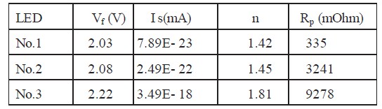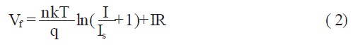 式中: I 為正向電流;n 為理想因子;k 為玻爾茲曼常數(1.38x10- 23 J /K) ; T 為溫度( 298K 或25℃) ;q 為電子電量( 1.602x10- 19 C) ;Is 為飽和電流; R 為寄生電阻;本文以西鐵成公司的發光二極管為例, 其特性參數如表1 所示。