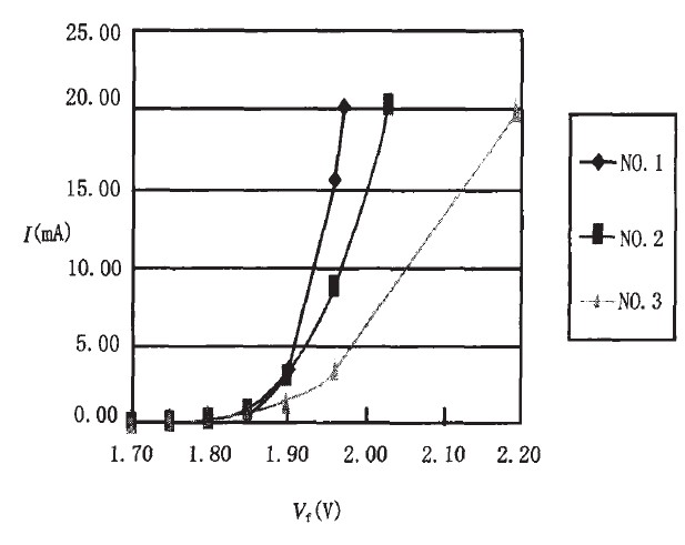 依據式(2) ,使用對分法[2]計算出在不同正向電壓下,三種LED 的正向電流,如圖2 所示。