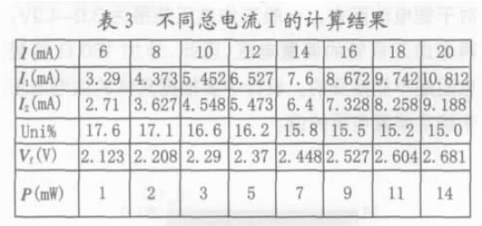 計算機利用對分法算出了在總電流為15mA,外加偏置電阻(R)為R4=R5=0 , 22 , 47 , 68 , 100 , 150, 200 (Ω) 時, D1 和D2 的電流( I1 和I2) 、亮度均勻性( Uni)、正向電壓(V5) 、以及偏置電阻帶來的功耗(P)。