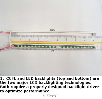 典型的LCD背光可以是1個或多個冷陰極熒光燈(CCFL),或是一組發光二極管(LED)陣列。圖1分別給出了采用這兩種技術的一個例子。背光圖像的質量在很大程度上取決于背光驅動器。在本文中,我們將討論有助于CCFL和LED發展的一些注意事項,以及如何為這兩種背光供電。
