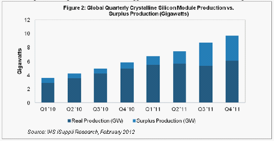 2011年光伏供應(yīng)商的過剩產(chǎn)能達到9.96GW,比2010年的3.01GW劇增231%。去年的實際需求為22.7GW,高于2010年的15.7GW。