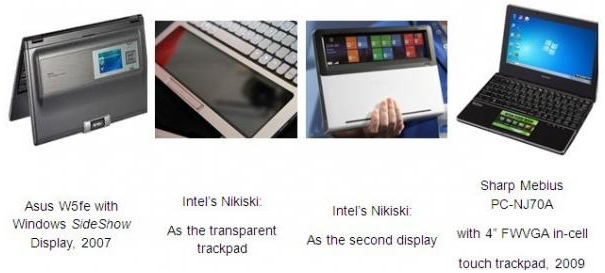 除了將觸控導入于筆記本電腦屏幕外,從過去到現在也一直有新的創意想法在開發、進行中。過去當Windows Vista問世時,SideShow的功能讓筆記本電腦多了一個小屏幕(如Asus W5fe)。雖然當時并不是觸控屏幕而是采實體按鍵,但對于一些簡單的操作目的(像是信件、日程、音樂播放等),用戶就不需要打開筆記本電腦、而直接于這個小屏幕操作。后來的創意還有像是:SHARP將In-Cell內嵌式觸控面板導入筆記本電腦的觸摸板,以及Intel于2012年CES展中所揭示的Nikiski概念。Nikiski在正常鍵盤輸入時可充當觸摸板,合起來時又如同SideShow的附加屏幕,不過卻可以觸控支持Metro接口的使用。受限于當時時空環境里消費者使用情境、相關技術、成本等因素的成熟度與配合,這些創意或其衍伸當時并未真正導入市場,不過這并不代表這些創意未來就沒有面市的可能性。