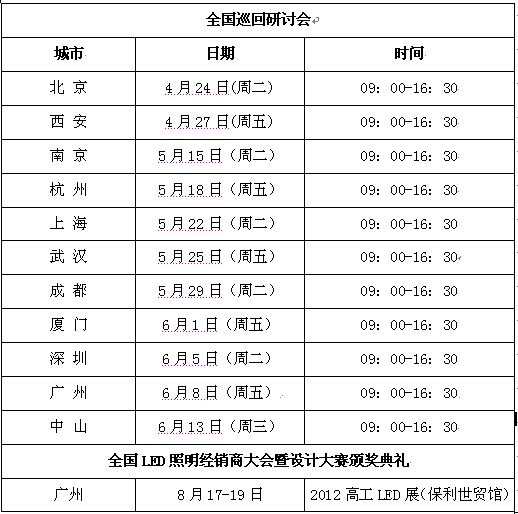 整個巡回研討會暨大賽將持續(xù)5個月時間,3月份為活動啟動宣傳階段,4-5月份為全國巡回研討及大賽報名階段,6‐8 月份為大賽作品提交及評審階段。巡回總結(jié)大會暨設(shè)計大賽頒獎典禮將于2012 高工LED 展期間(8 月17 日)在廣州保利世貿(mào)館召開。