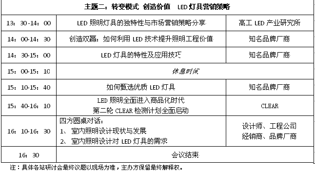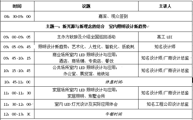 2012是高工LED的渠道年、服務(wù)年,為推廣LED照明節(jié)能產(chǎn)品,分享LED照明設(shè)計理念,增進LED照明廠商、設(shè)計師、工程商、經(jīng)銷商之間的交流與合作,推動LED燈具在家居、酒店、別墅會所、商場鋪、專賣店、餐飲、辦公、展館、地鐵站等室內(nèi)照明中的應(yīng)用。高工LED將進行第三次長征(2010年全國LED產(chǎn)業(yè)調(diào)研、2011年全國燈具城調(diào)研),由高工LED、高工LED商城、《高工LED產(chǎn)品與市場》雜志聯(lián)合全國各地室內(nèi)裝飾設(shè)計協(xié)會、建筑設(shè)計機構(gòu)、照明及LED行業(yè)協(xié)會共同舉辦的“2012 LED照亮中國之旅”渠道開拓活動-室內(nèi)LED照明設(shè)計全國巡回研討會暨全國室內(nèi)LED照明設(shè)計大賽,將于4‐8月在北京、西安、南京、杭州、上海、武漢、成都、廈門、深圳、廣州、中山11個重點城市舉辦。整個巡回研討會將有全國近1500名來自設(shè)計機構(gòu)、工程公司、經(jīng)銷商等單位專業(yè)人士參加,活動將覆蓋超過20萬設(shè)計、工程、經(jīng)銷等各渠道群體。