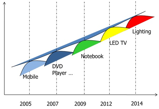 綜觀LED的發(fā)展過(guò)程,2002年起LED從小尺寸顯示器(主要應(yīng)用在手機(jī)上)開(kāi)始滲透,在2005年達(dá)到高峰。但是隨著效率的提升,單位顯示器使用的LED顆數(shù)也逐漸減少。當(dāng)手機(jī)成長(zhǎng)趨于飽和狀態(tài)下,LED總需求量便開(kāi)始下滑。在此時(shí)LED便開(kāi)始尋找下一個(gè)應(yīng)用:中尺寸顯示器。隨著性?xún)r(jià)比的不斷提升,LED于2007年在中尺寸顯示器的需求達(dá)到飽和,與先前小尺寸一樣LED需求開(kāi)始往下。LED開(kāi)始進(jìn)入到另一個(gè)應(yīng)用:筆記本電腦顯示器,并于2009年底開(kāi)始進(jìn)入電視顯示器的應(yīng)用。隨著LED在大尺寸顯示器的廣泛應(yīng)用,LED的性能已經(jīng)提升到每瓦100流明以上,而價(jià)格也快速下降,此趨勢(shì)對(duì)于LED在照明應(yīng)用的發(fā)展有著無(wú)比的助力。