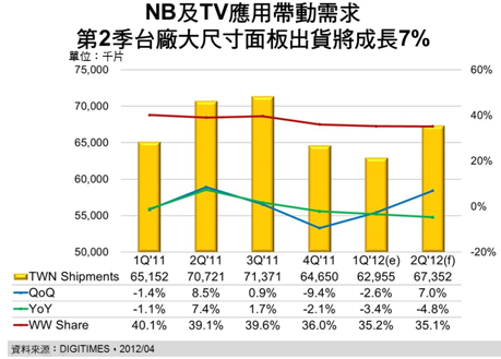 2012年第2季臺廠大尺寸(9寸以上)TFT LCD面板總出貨量將為6,735.2萬片,較前一季增加7%,但較2011年同期則減少4.8%,DIGITIMES Research資深分析師兼副主任黃銘章分析,主要原因為彩晶及華映相繼地淡出大尺寸面板市場,2011年華映的各類NB面板出貨達到664萬片,但2012年將降至不足100萬片。因此,預期臺廠佔全球出貨量比重在第2季仍將微幅下跌0.1個百分點至35.1%。