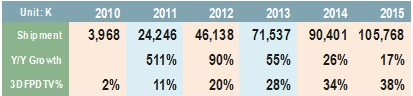 表一、2010-2015年3D電視出貨量與滲透率