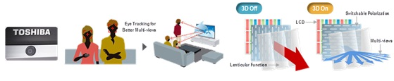正當快門式與偏光式技術相互廝殺的同時,Toshiba已悄悄地發布裸眼式3D電視,將3D電視的技術競爭提升到另一個新的層次。Toshiba除了以12寸和20寸等級來試探市場外,還在2011 CES上展示56寸和65寸的裸眼式3D電視。雖然除了Toshiba外,SONY和LG也分別展示裸眼技術的3D電視,但是僅有Toshiba宣示將于2011年生產大尺寸的裸眼式3D電視,特別是2011年底發布的55X3。
