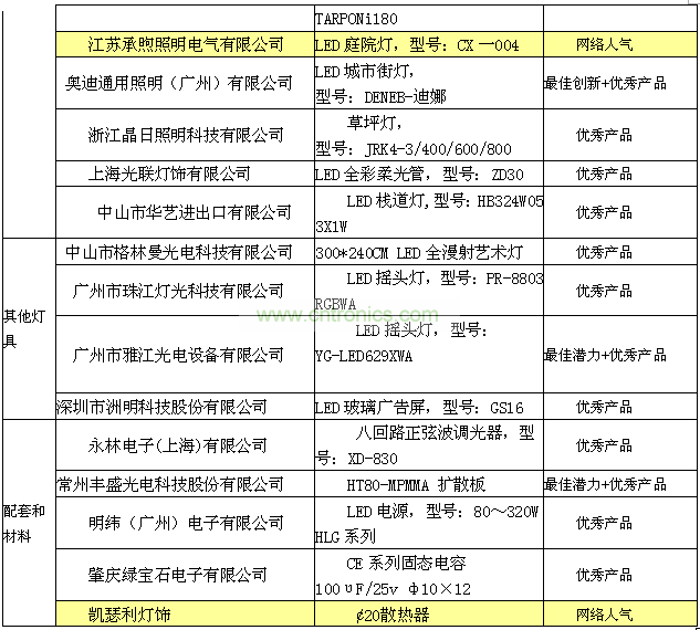 2012年6月9日,2012廣州國際照明展覽會開幕當天,主辦方組織20名終審專家對終審會議評選出來的獲獎候選產品進行現場的考核評審,最終確定35個優秀產品獎,3個最佳創新獎、5個最佳潛力獎的獲獎名單;5個最佳網絡人氣獎是由網友海選出來的名單。