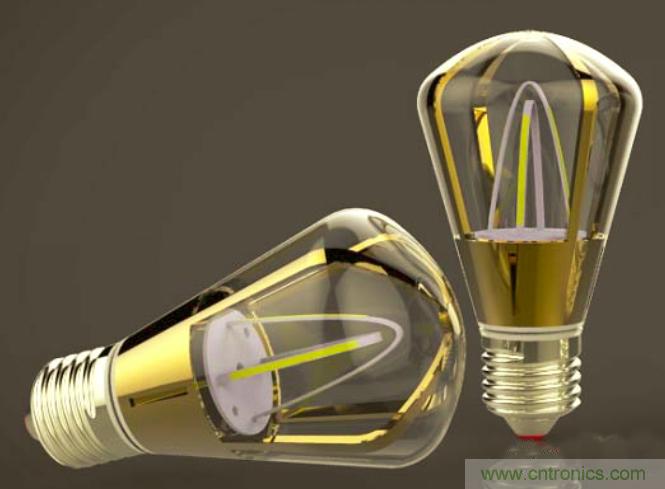 今天的LED燈絲燈已經可以做到像白熾燈一樣調光,而且無頻閃,量產水平普遍達到5瓦,最近顏重光高工又對LED燈絲燈做出了重大的設計創新,LED燈絲做在鋁基板上,不充氣,PC外罩下面配一圈鋁散熱器,色溫穩定性做得比現有產品還要好,而且外觀極其華麗奪目,很像一款藝術品,連我看了都有了購買的沖動。