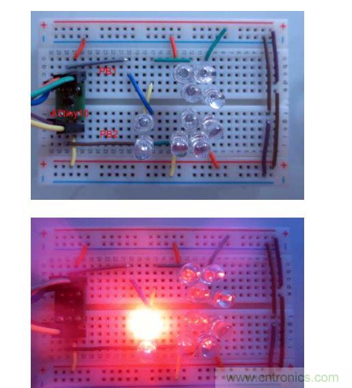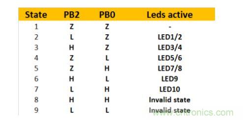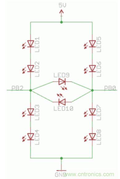 當PB0和PB2中有一個引腳處于高電平或低電平狀態(tài),而另一個引腳為高阻抗狀態(tài)時,那就會有一對LED會發(fā)光。而當PB0為高電平而PB2為低電平或恰好相反時,LED9或LED10就將和一對LED并聯(lián)。這時大部分的電流會流過單個LED,所以這時只有LED9或LED10會發(fā)光。