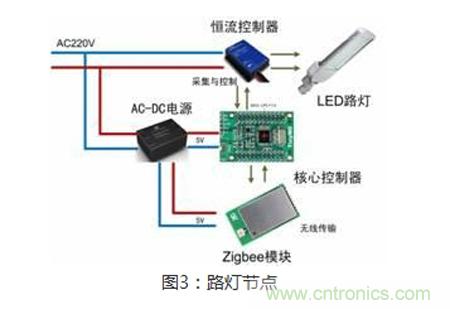 傳感器和LED燈組成。每個節(jié)點通過ZigBee接收命令,并實時匯報每盞路燈的亮、滅情況、實現(xiàn)亮度調(diào)節(jié)、傳送電能負(fù)荷狀態(tài)、完成燈桿損壞報警與漏電報警、接收來自ZigBee集中器的查詢命令、控制命令等。