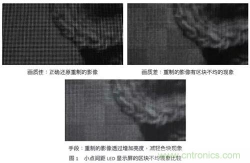 在室內(nèi)應(yīng)用中,LED顯示屏的亮度多介于300到1000尼特(nit),將此亮度轉(zhuǎn)換成LED順向電流,約當(dāng)于1~5mA,甚至小于1mA。因此,驅(qū)動(dòng)芯片的小電流集中度變得很重要。當(dāng)驅(qū)動(dòng)芯片電流精度不佳,小點(diǎn)間距LED顯示屏就容易出現(xiàn)區(qū)塊不均的色塊,然而為掩飾色塊這個(gè)缺陷,通常會(huì)采取提高LED電流這個(gè)手段,來(lái)增加顯示屏的亮度。但帶來(lái)的缺點(diǎn)是,當(dāng)觀眾注視這個(gè)LED顯示屏一段時(shí)間后,眼睛容易感覺(jué)不適。圖1所演示的是小點(diǎn)間距LED顯示屏,在使用不同質(zhì)量的LED驅(qū)動(dòng)芯片時(shí),重制圖像后的實(shí)際差異。