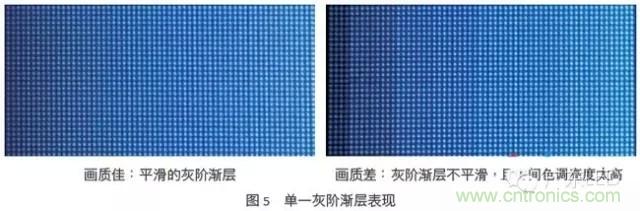 小點(diǎn)間距LED顯示屏為時(shí)序掃描式(multiplexed)的顯示器,非液晶屏幕的hold-type顯示器,所以刷新率對(duì)于小點(diǎn)間距LED顯示屏來(lái)說(shuō)相當(dāng)?shù)刂匾^低的刷新率不僅會(huì)使小點(diǎn)間距LED顯示屏觀賞起來(lái)有閃爍的不適感,容易使造成觀賞者暈炫,而且會(huì)使灰階漸層的效果不平滑。以圖4為例,右圖臉部的灰階漸層效果較左圖的不平滑,有類(lèi)似等高線的現(xiàn)象,從圖5的灰階漸層測(cè)試畫(huà)面也可以看出右圖的小點(diǎn)間距LED顯示屏的連續(xù)性比左圖的差。