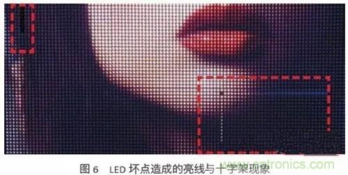 現(xiàn)今的LED磊晶與封裝技術(shù)與日俱增,但LED經(jīng)過(guò)長(zhǎng)時(shí)間的使用后仍難免會(huì)有損壞,與液晶屏幕不同的是,壞掉的LED會(huì)在小點(diǎn)間距LED顯示屏形成亮線或是十字架,而不是一個(gè)黑點(diǎn),如圖6所示。對(duì)LED顯示屏制造商,營(yíng)運(yùn)商與觀眾而言,都是一大困擾。