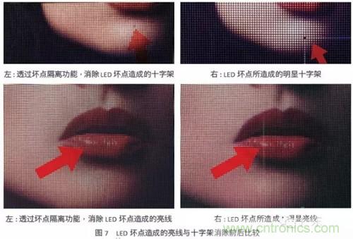 一個(gè)好的小點(diǎn)間距LED顯示屏必須要能消除因LED壞點(diǎn)所造成惱人的亮線或十字架現(xiàn)象,如圖7左圖所示。唯有采用具有“壞點(diǎn)隔離”功能(dead pixel isolation)的LED驅(qū)動(dòng)芯片,才能維持小點(diǎn)間距LED顯示屏的正常運(yùn)作,并可方便用戶彈性安排維修時(shí)程。