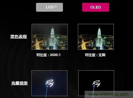 OLED電視由于顯示原理的不同,在畫質(zhì)方面相較LCD液晶電視的優(yōu)勢還體現(xiàn)在它的對比度上,因為OLED的所有像素都是自發(fā)光,所以理論上對比度是無限的,因而可以呈現(xiàn)完美的黑色顯示;而LCD電視無法完全遮擋背光源的光線,不可避免出現(xiàn)漏光和光暈現(xiàn)象,并且大部分傳統(tǒng)的LCD電視對比度不到5000:1,播放純黑畫面時則呈現(xiàn)為深灰色。