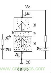 傳統講法一般分三步,以NPN型為例(以下所有討論皆以NPN型硅管為例),如示意圖A。1.發射區向基區注入電子;2.電子在基區的擴散與復合;3.集電區收集由基區擴散過來的電子。”(注1)