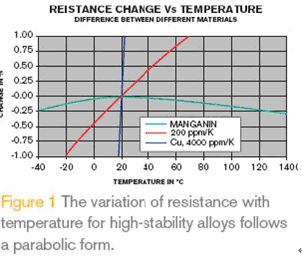 圖1 是錳鎳銅合金電阻的典型溫度特性曲線,溫度系數TCR單位為ppm/K,在20或25°C 時,TCR=[R(T)-R(T0)]/R(T0) ×(T-T0),對于溫度系數的定義,制造商標明溫度的上限是必要的,舉例說明在+20 -+60°C的溫度范圍內,測量系統經常選用TCR為幾百個ppm/K 的低阻值的厚膜電阻器,圖1中紅色曲線表示TCR 為200 ppm/K的電阻器的溫度特性,即使在如此小的范圍內,+50°C的溫度變化就足以導致阻值變化超過1%,這樣的電阻是不能用于精確電流測量的,有些測量設備制造商甚至使用PCB走線的銅膜作為電流取樣電阻,銅的TCR是4000 ppm/K(or 0.4%/K),2.5°C的溫度變化就足以造成1%的誤差。