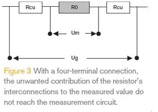 在低阻值電阻中,端子的阻值和溫度系數的影響往往是不能忽略的,實際設計中應充分考慮這些因素,可以使用附加的取樣端子直接測量金屬材料兩端的電壓。如圖3所示,一個四端子的連接將允許測量系統實際用到的阻值為R0,而普通的連接的阻值為R0+2xRCu 。例如,10 mm長0.3 mm線徑的銅線會增加2.4 mΩ的RCu阻值,4mm長0.2mm寬 35 μm厚度的PCB引線的RCu阻值是10 mΩ