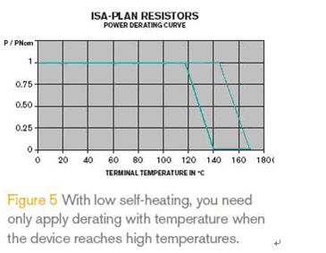 這種結構的電阻可以在非常高的溫度下滿負荷工作,如圖5所示在很高的溫度下才出現功率折減;同時,電阻材料的溫度可以維持在較低水平,這就可以有效改善電阻的長期穩定性和因溫度而引起的阻值變化。