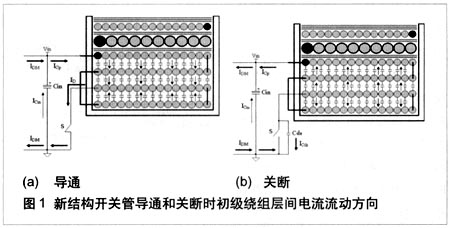 對于常規的4層初級繞組結構,在開關管導通和關斷的過程中,層間的電流向同一個方向流動。在圖1中,在開關管導通時,源極接到初級的地,B點電壓為0,A點電壓為Vin,基于電壓的變化方向,初級繞組層間電容中電流流動方向向下,累積形成的差模電流值大。在功率器件關斷瞬間,MOSFET漏-源極電容充電,變壓器初級繞組的層間電容放電,這兩部分電流也會形成差模電流。同樣,基于電壓的變化方向,初級繞組層間電容中的電流流動方向向上,累積形成的差模電流值大。