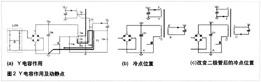 共模電流在輸入及輸出線與大地間流動,主要有下面幾部分:通過MOSFET源級到大地的電容Cde。如果改進IC的設計,如對于單芯片電源芯片,將MOSFET源極連接到芯片基極,用于散熱,而不是用漏極進行散熱,這樣可以減小漏極對大地的寄生電容。PCB布線時減小漏極區銅皮的面積可減小漏極對大地的寄生電容,但要注意保證芯片的溫度滿足設計的要求;通過Cm 和Cme產生共模電流;通過Ca和 Cme產生共模電流;通過Ct和Coe產生共模電流;通過Cs和Coe產生共模電流,這部分在共模電流中占主導作用。減小漏極電壓的變化幅值及變化率可減小共模電流,如降低反射電壓,加大漏-源極電容,但這樣會使MOSFET承受大的電流應力,其溫度將增加,同時加大漏-源極電容,產生更強的磁場。如果系統加了Y電容,如圖2所示,通過Cs的大部分共模電流被Y 電容旁路,返回到初級的地,因為Y電容的值大于Coe。Y電容必須直接并用盡量短的直線連接到初級和次級的冷點。如果導通時MOSFET的dV/dt大于關斷時的值,Y電容則連接到初級的地,反之連接到Vin。