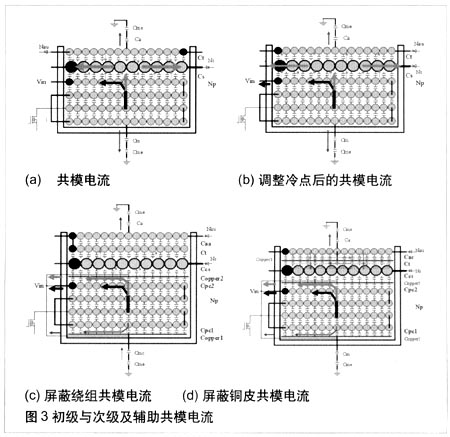 如果在內層及初級、次級繞組間放置銅皮,銅皮的寬度小于或等于初級繞組的寬度,銅皮的中點由導線連到冷點,如圖3(c)所示,由于銅皮為冷點,與其接觸的繞組和銅皮間電壓的擺率降低,從而減小共模電流,同時將共模電流由銅皮旁路引入到冷點。注意銅皮的搭接處不能短路,用絕緣膠帶隔開,內外層銅皮的方向要一致。輔助繞組和次級繞組的共模電流可以由以下方法補償:① 加輔助屏蔽繞組:輔助屏蔽繞組繞制方向與次級繞組保持一致,輔助屏蔽繞組與次級繞組的同名端連接到一起,并連接到冷點,輔助屏蔽繞組的另一端浮空。由于它們的電壓變化的方向相同,所以兩者間沒有電流流動。②加外層的輔助屏蔽銅皮:輔助屏蔽銅皮的中點連接到輔助繞組的中點。同樣,基于電壓的變化方向分析電流的方向,可以看到,兩者之間的電流形成環流,相互補償抵消,從而降低共模電流。