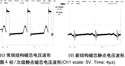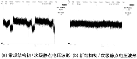 測量變壓器初級和次級靜點的電壓波形及變壓器磁芯的電壓波形,可以為EMI的傳導測試提供一些參考(見圖4)。常規結構變壓器的初級和次級靜點電壓波形的幅值為10V,并且可以明顯地看到基于開關頻率的開關波形。新結構變壓器的初級和次級靜點電壓波形的幅值為5V,基于開關頻率的開關波形不是很明顯。常規結構的變壓器的磁芯電壓波形的幅值為18V,可以明顯地看到基于開關頻率的開關波形。新結構的變壓器的磁芯電壓波形的幅值為5V,基于開關頻率的開關波形不是很明顯。