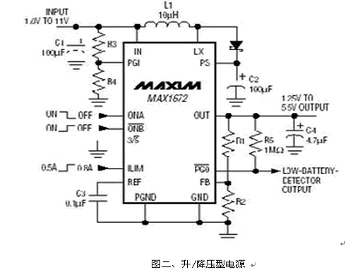 設計者也可以直接用一組Buck/Boost電源IC產生所需要的電壓輸出, 圖二便是一組直接升/降壓轉換IC。它結合了一組升壓轉換器和線性穩壓器,提供既可以升壓,也可以降壓的轉換方案。這個轉換器在輸入電壓高于或低于輸出電壓時能夠提供一個穩定的輸出,允許輸入范圍:1.8V至11V,可預置為3.3V或5V輸出,也可以使用兩個分壓電阻得到可調節的輸出電壓:1.25V至5.5V,效率可達85%。如果需要3.5V至4V之間的輸出,可以用升壓轉換器與線性穩壓器相組合的方式實現。如:MAX1606升壓轉換器與MAX8512線性穩壓器的組合。