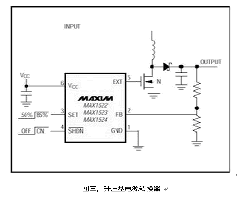 有些設計者為了追求較高的轉換效率, 選擇了升壓方式,產生一組高于輸入的穩定輸出, 如圖三的升壓架構。由于功率開關MOSFET是外置的, 可提供較大的輸出功率。在輸出功率許可的條件下,也可以選擇內置MOSFET功率開關的升壓轉換器,如MAX1722, 可有效節省空間、降低成本。