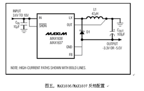 也可以選擇負電壓輸出轉換器, 圖六便是常用的PWM負壓轉換器, 外部元件少、設計簡易, 工作在固定頻率的PWM結構干擾較小。