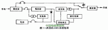UPS不問斷電源是個特殊的設備,它既是電網的負載,又要給負載提供電源。所以它的EMC設計既要保證它不對電網造成電磁污染,又要保證它提供給負載的是個干凈的電源。UPS本身振蕩電路就是一個干擾源。典型的UPS系統框圖如圖l所示。它的基本結構是一套將交流市電變為直流電的整流器、充電器和把直流電再變為交流電的逆變器,電池在交流正常供電對儲存能量且維持在一個正常的充電電壓上.一旦市電中斷,蓄電池立即對逆變器供電 保證UPS交流輸出。